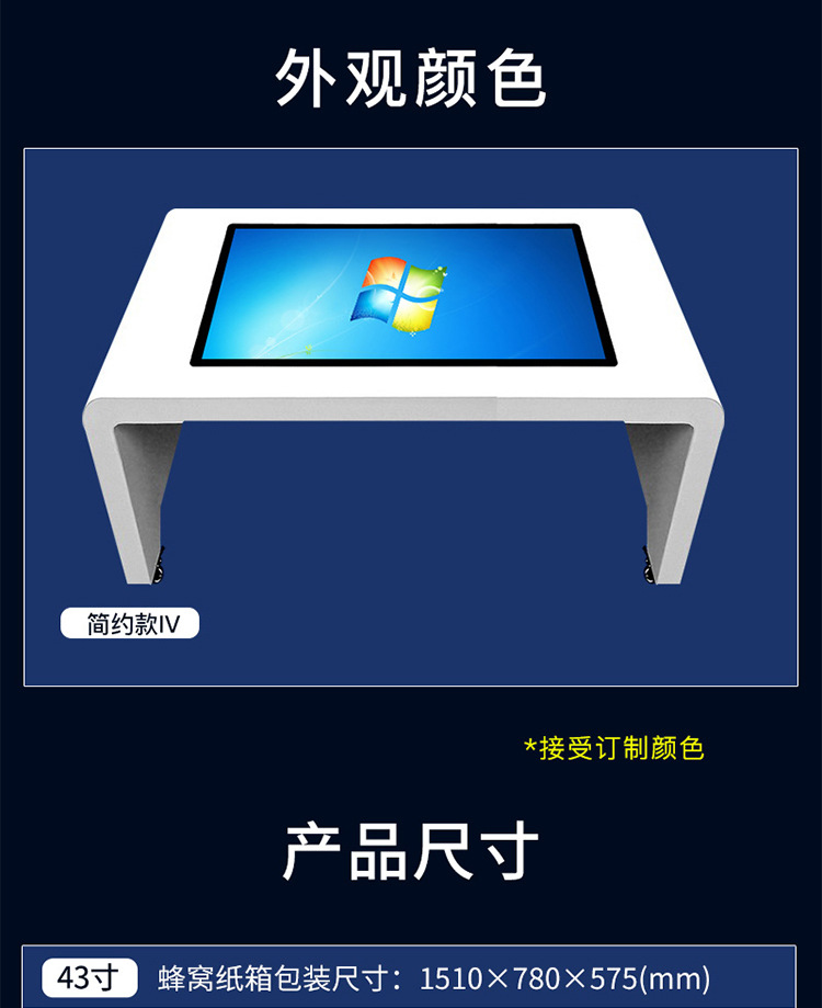 電容觸摸茶幾采用全鋼化玻璃與無輻射、抗干擾的金屬結合而成,鋼化玻璃能有效防止設備發生意外情況而破碎時劃傷他人。默認玻璃顏色為黑色,鈑金顏色為白色,其他顏色可定制。